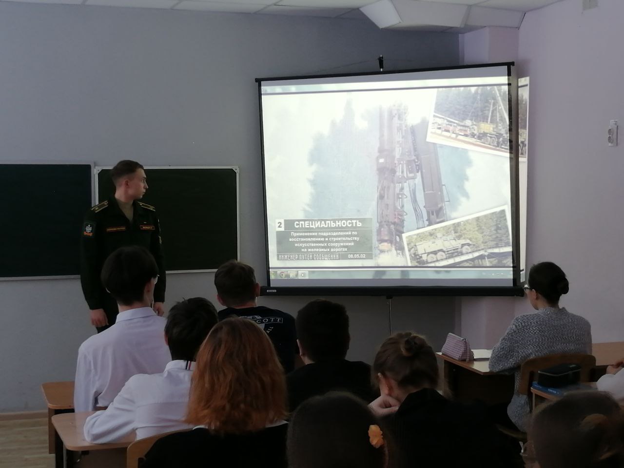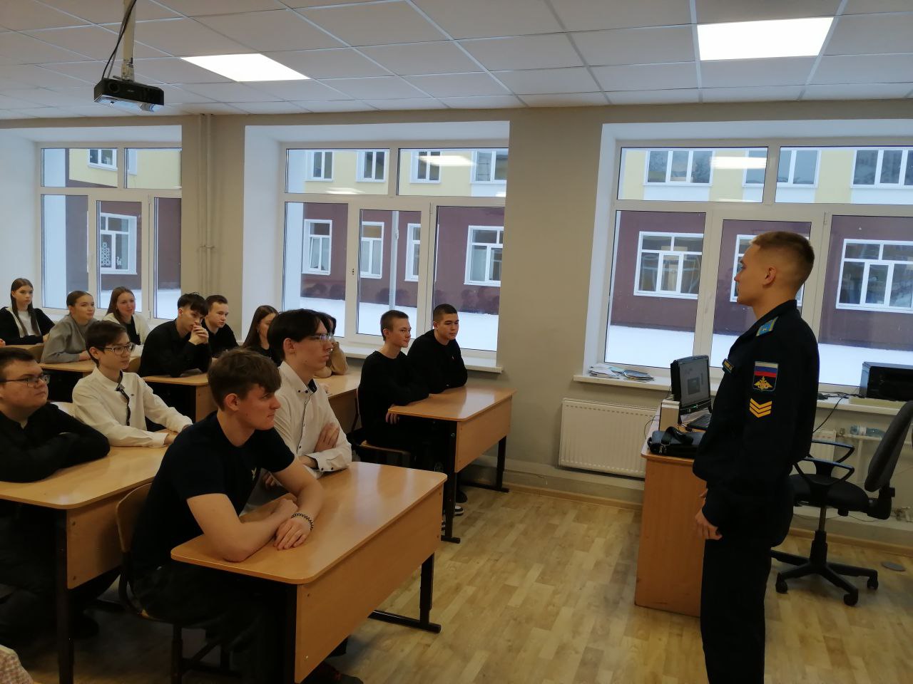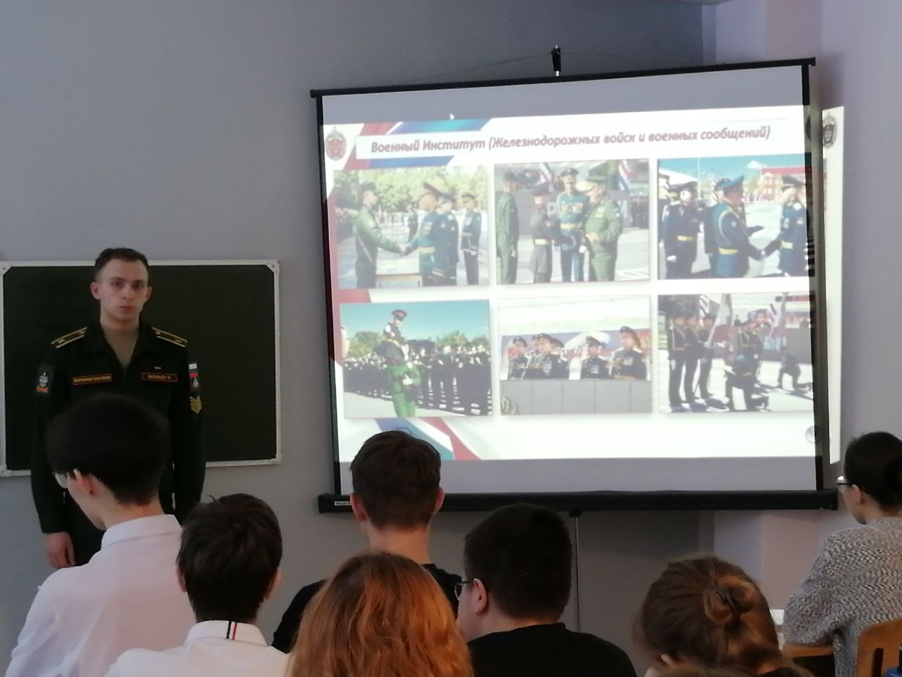 22 декабря обучающиеся 10-11 классов школы №24 встретились с представителем престижного учебного заведения Вооруженных Сил России — Васильевым Г.Р., курсантом Военного института железнодорожных войск и военных сообщений Военной академии материально-технического обеспечения имени генерала армии А.В. Хрулёва.