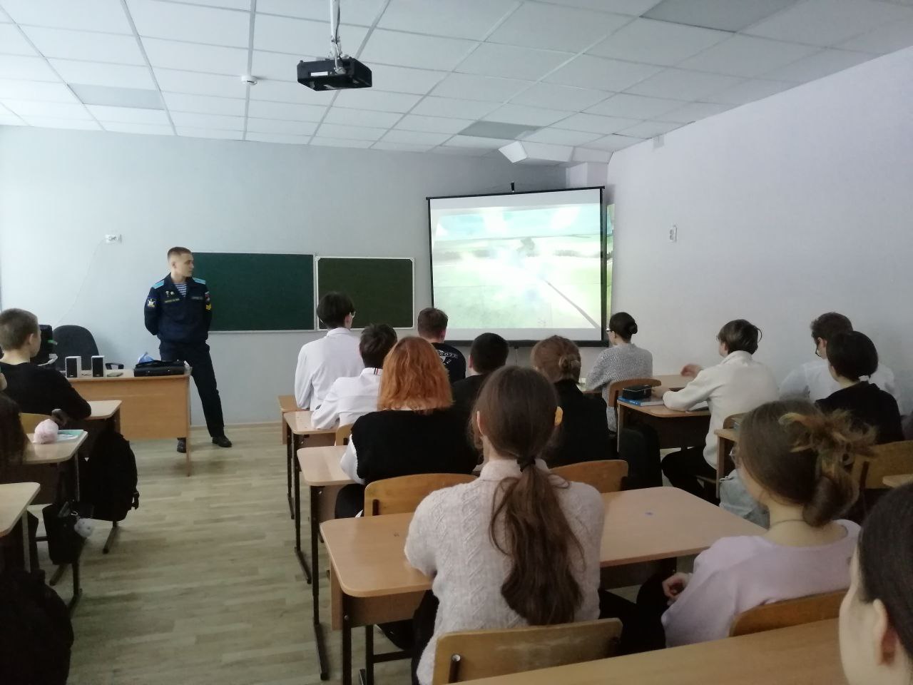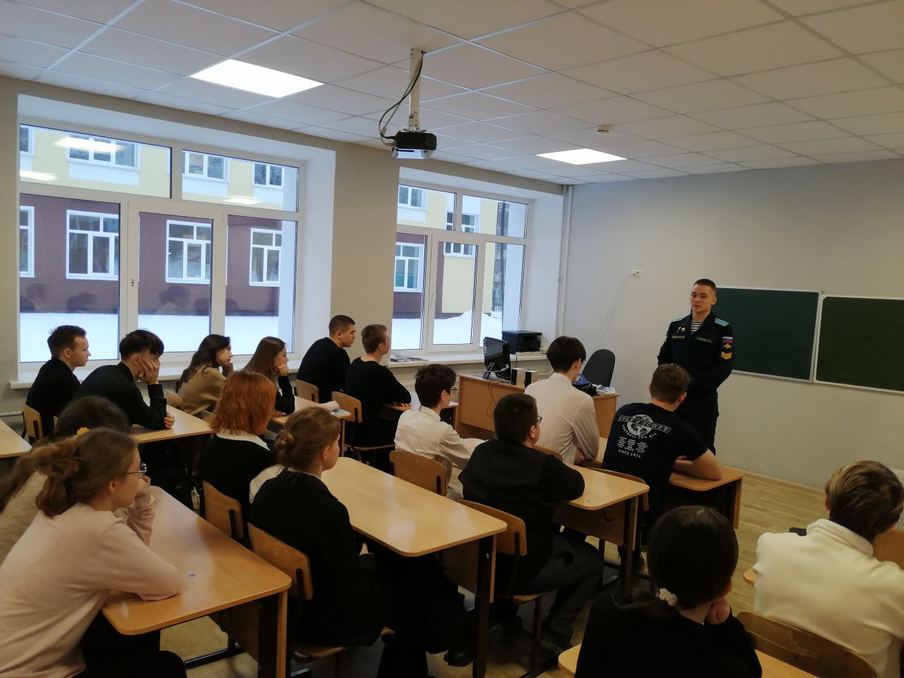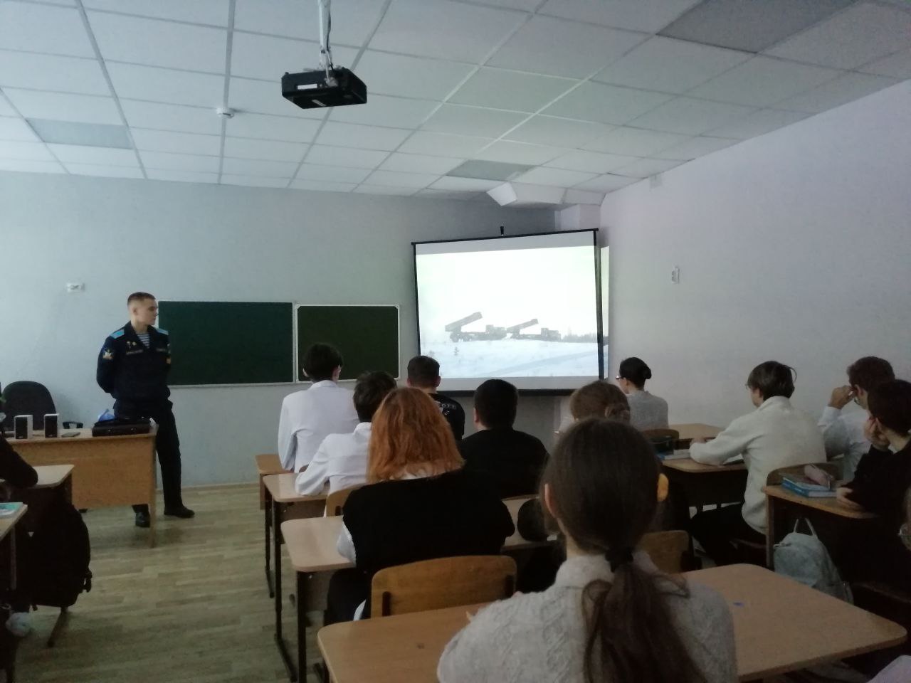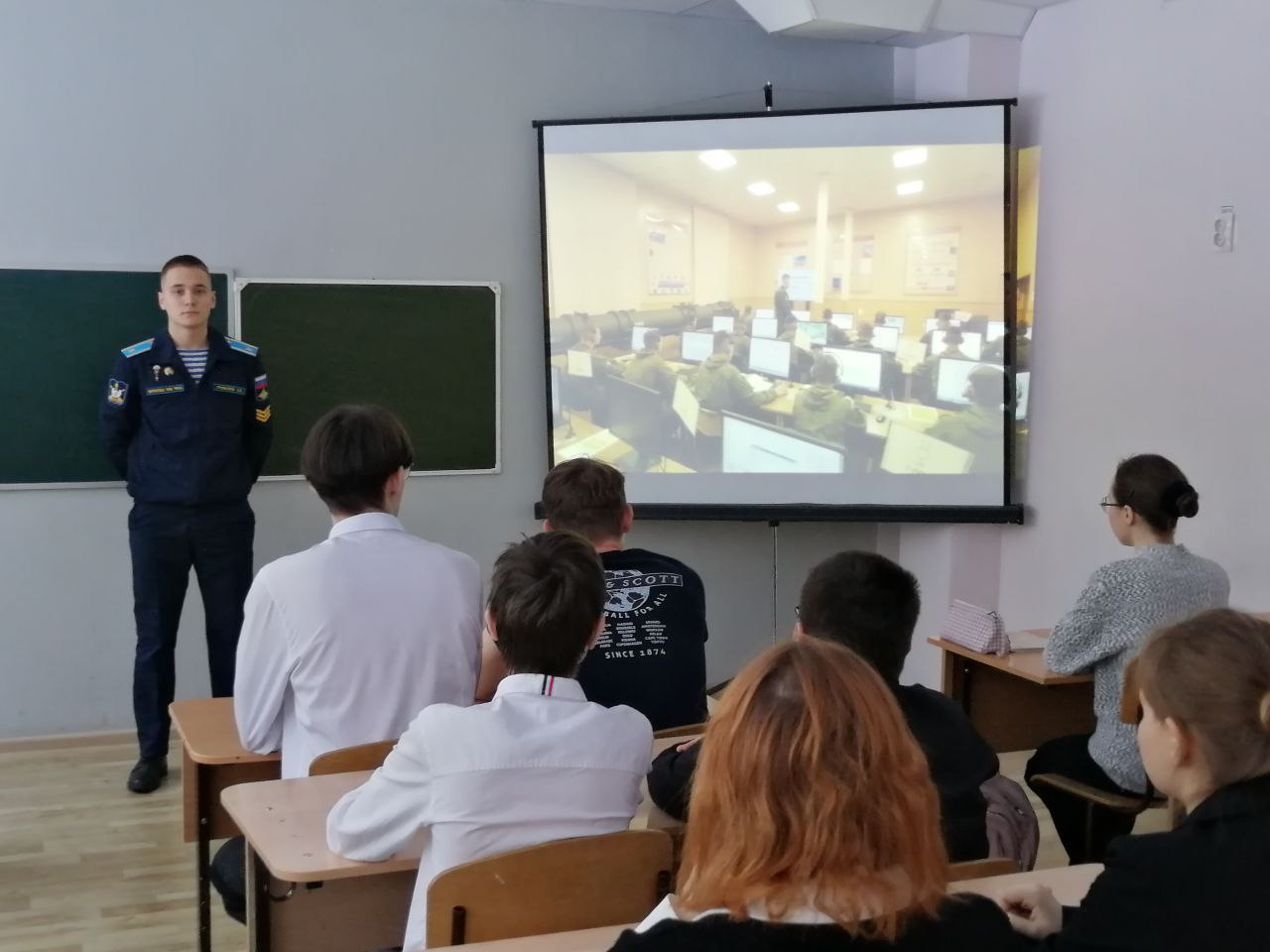 Геннадий Радиевич подробно познакомил ребят с историей вуза, особенностями подготовки кадров, условиями поступления и мер социальной защиты студентов-курсантов. Обучающимся была представлена наглядная презентация образовательного процесса и условий проживания курсантов. А еще учащиеся с большим вниманием посмотрели тематический фильм.