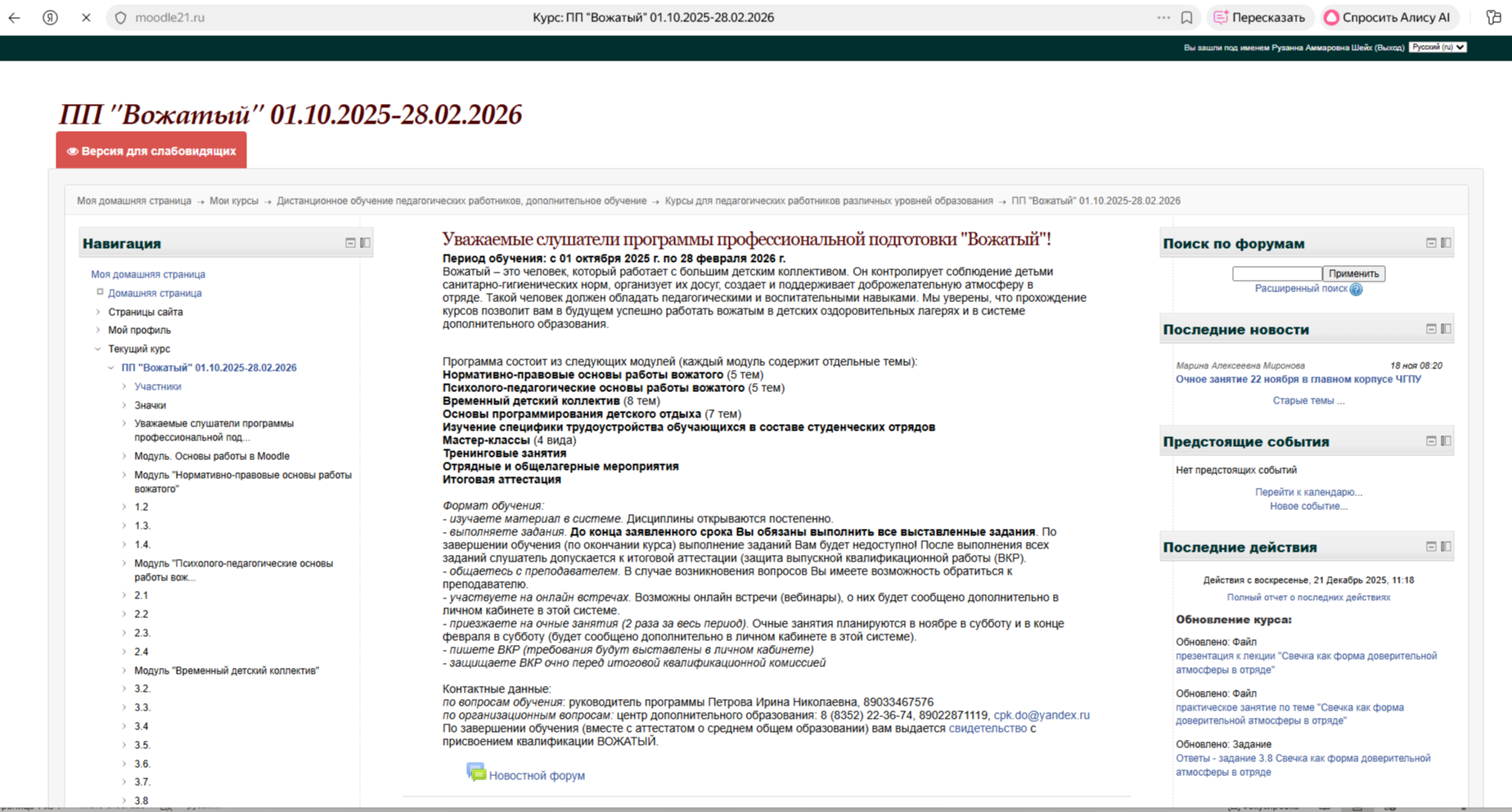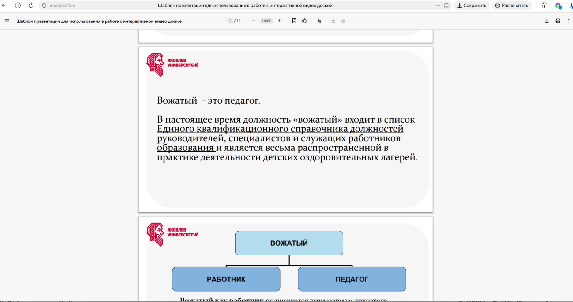 Учащиеся 10 класса школы №24 города Чебоксары продолжают успешно осваивать профессию «Вожатый» в рамках республиканского проекта «УПК-21 — Учебно-производственные классы», реализуемого совместно с Чувашским государственным педагогическим университетом имени И. Я. Яковлева. В настоящее время обучение проходит дистанционно на образовательной платформе Moodle, обеспечивающей комфортное самостоятельное изучение материала и гибкий учебный процесс.