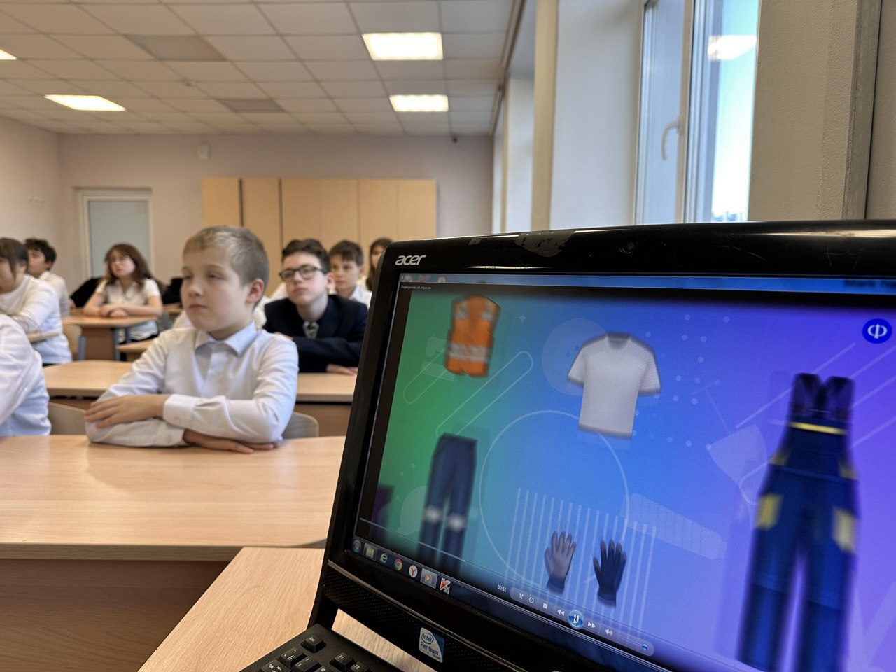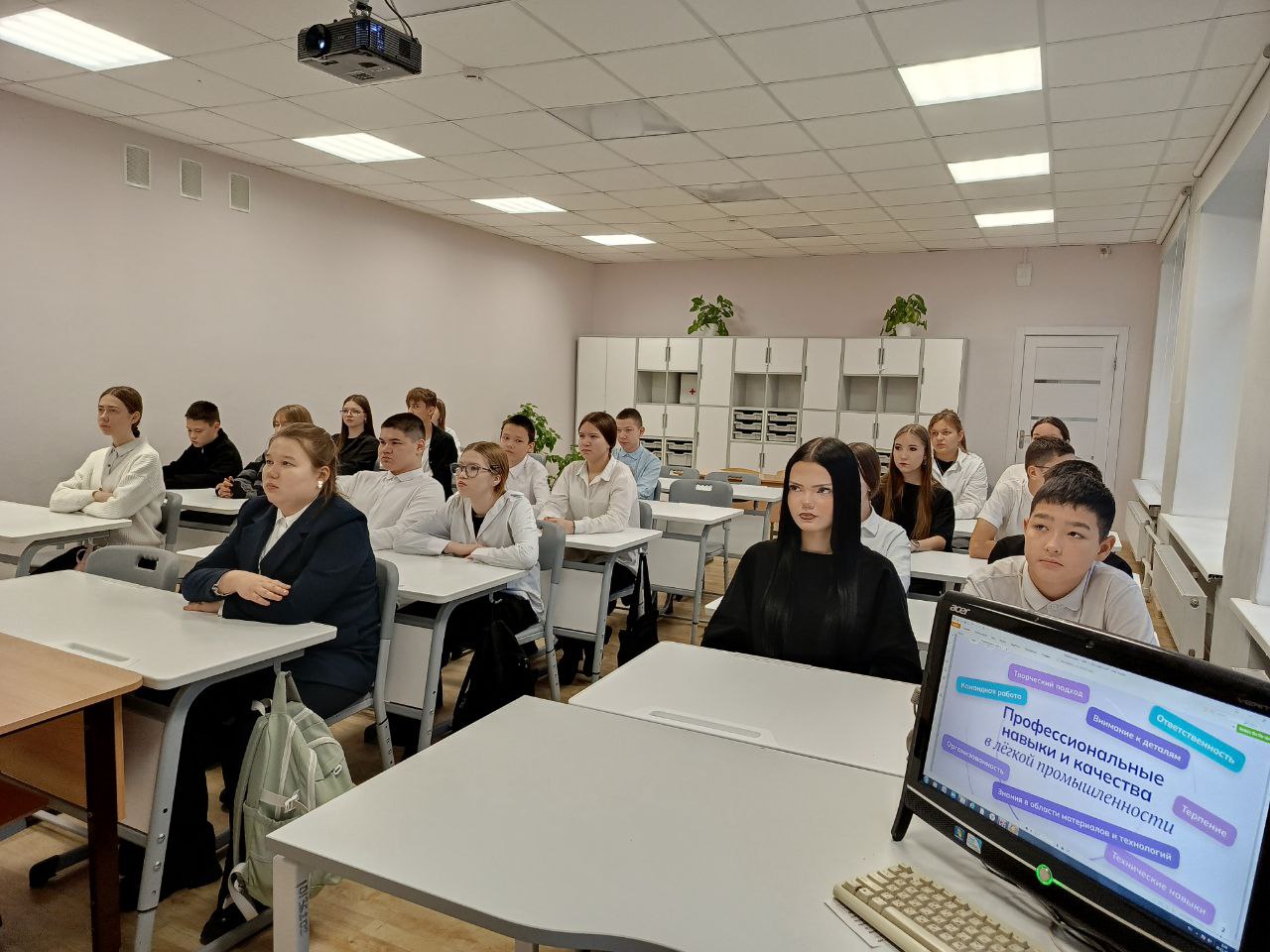 Школьники познакомились с технологиями и узнали, как идеи превращаются в реальность благодаря труду дизайнеров, мастеров по ткани, швей, закройщиков и многих других специалистов. О том, что в текстильной, трикотажной, кожевенной, обувной и швейной отраслях трудятся технологи производства, эксперты по материалам, 3D-модельеры, художники, ребятам рассказал Андрей Федотов, учитель, обладатель награды «Знание. Премия». В командной работе учащиеся стали свидетелями уникальной производственной цепочки от момента изготовления до получения готовой продукции и отметили в маршрутной карте профориентационного дневника много интересных профессий лёгкой промышленности, которая развивает регионы, укрепляет экономику страны, обеспечивает людей качественными продуктами отечественного производства.