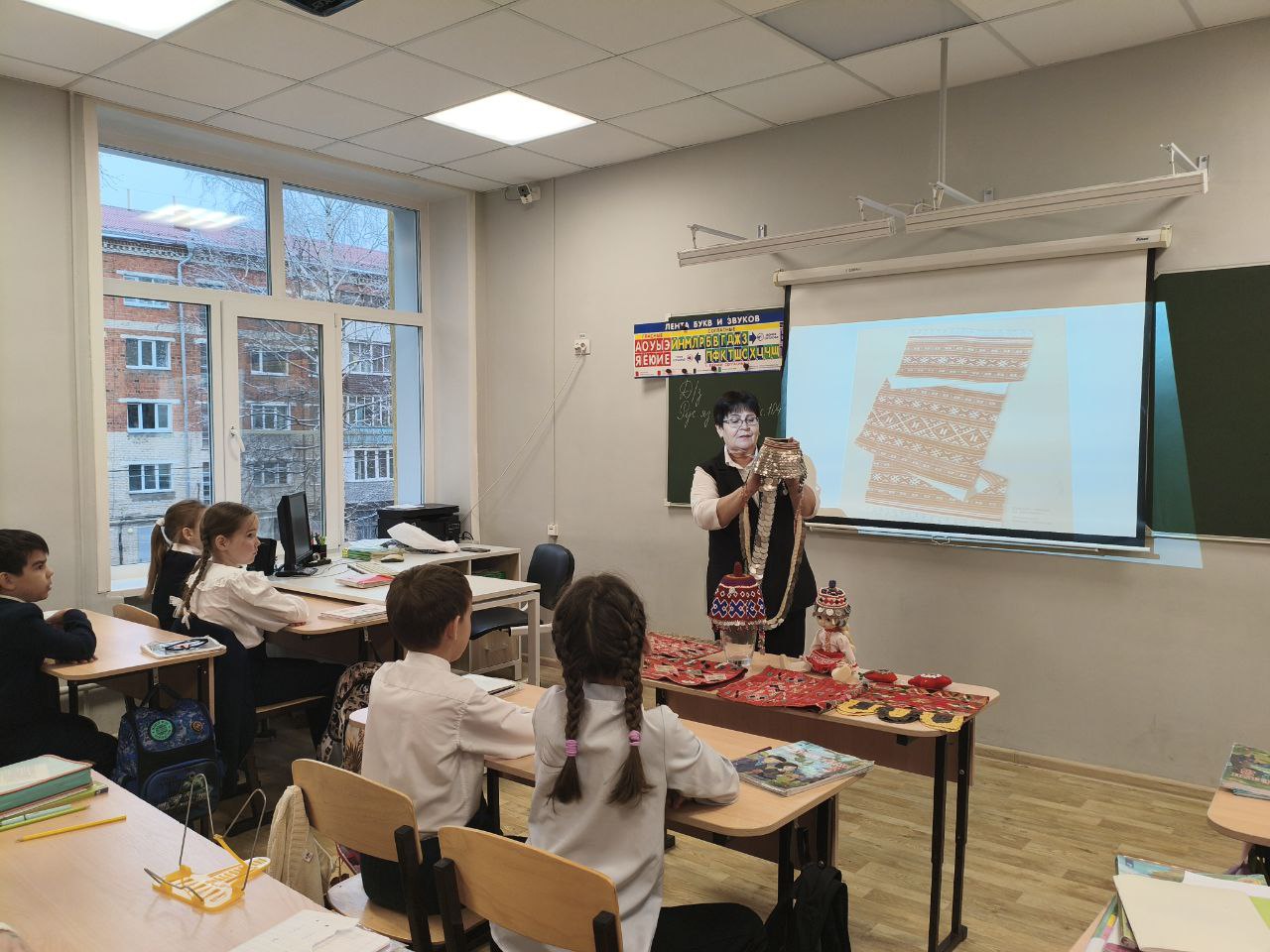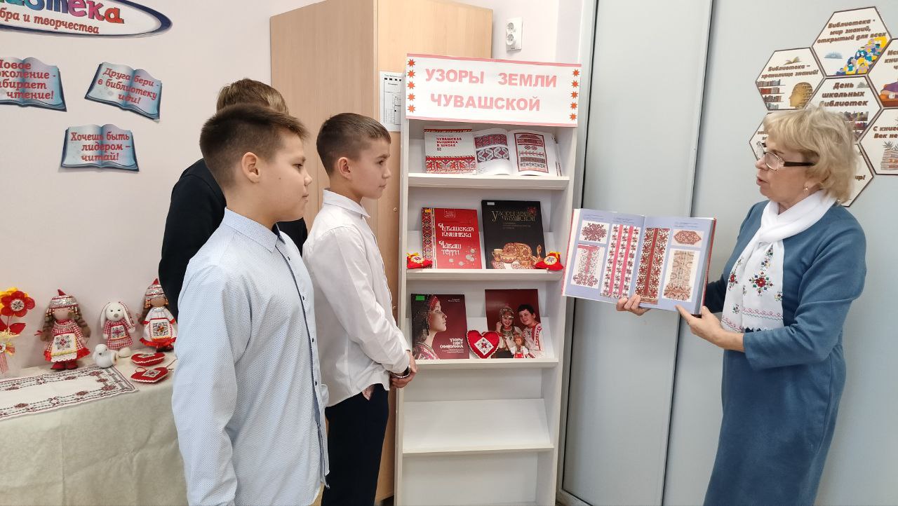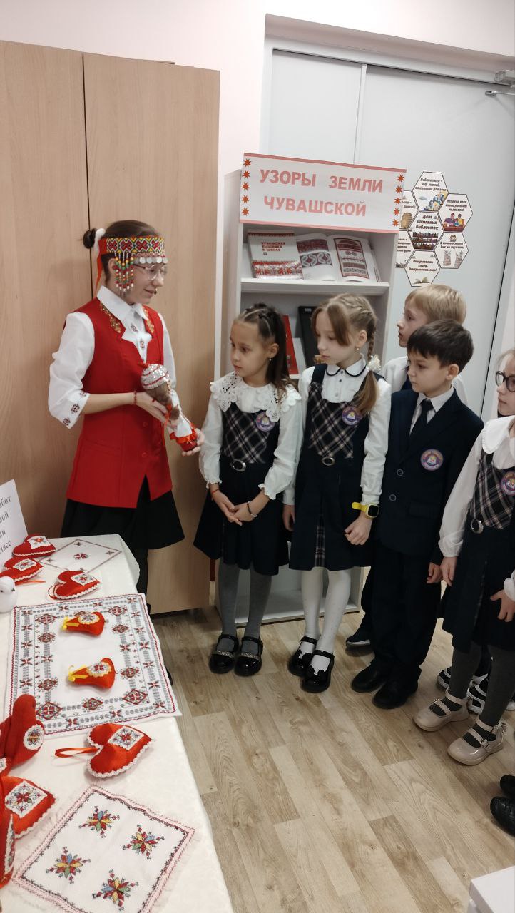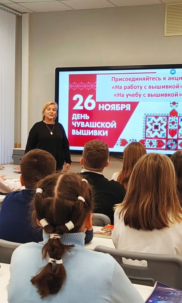 Обучающиеся 8а класса посетили Музей вышитой карты России. На экскурсии они узнали об истории создания карты, как 260 мастеров из разных уголков страны трудились, стараясь с помощью вышивки передать особенности своего региона. После экскурсии дети участвовали в тематических играх. Обучающиеся 4 н класса встретились с поэтессой Альбиной Юрату. Альбина Юрату рассказала детям о себе, познакомила со своим творчеством, прочитала произведения на русском и чувашском языках. Учителя и обучающиеся 7-8-х классов участвовали в краеведческой викторине «Живопись нитей: очарование чувашской вышивки», организованной МАУК «Объединение библиотек г. Чебоксары». Ребята узнали об истории чувашской вышивки, значении каждого орнамента, почему именно 26 ноября было выбрано днём чувашской вышивки.