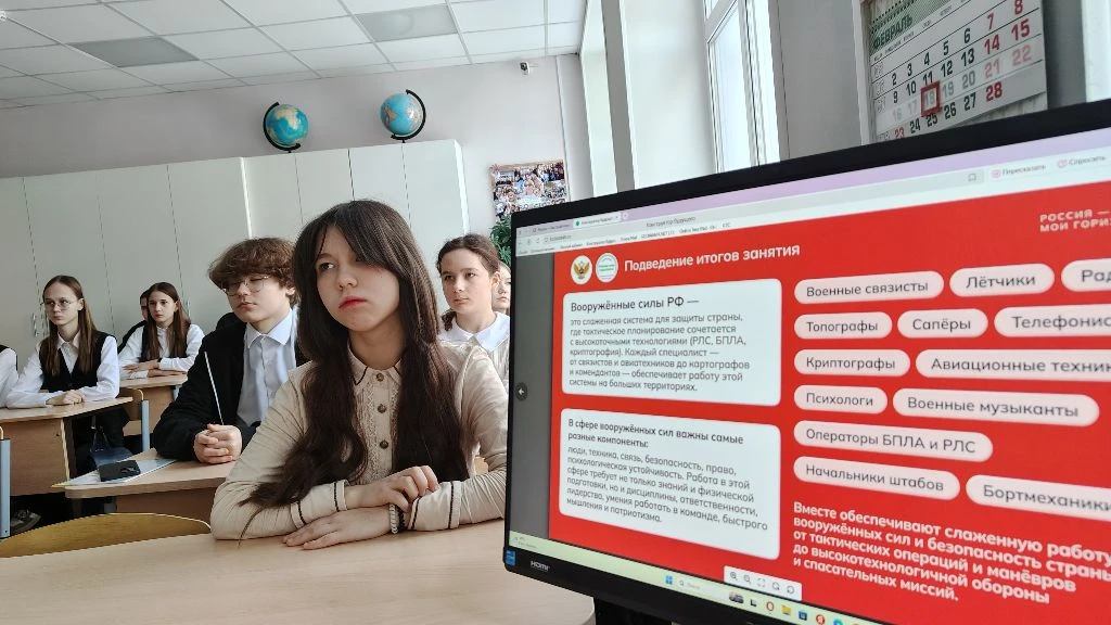 Школьники познакомились с Вооружёнными силами РФ, а также с Ракетными войсками стратегического назначения и Воздушно-десантными, обеспечивающими связь, разведку, инженерную поддержку и радиоэлектронную борьбу. Из видеоролика учащиеся узнали, где готовят будущих специалистов военно-патриотического движения («ЮНАРМИЯ», «Зарница 2.0», центры «Воин») и в какие военные учебные заведения можно подать документы (Ломоносовский морской колледж ВМФ, Военная академия воздушно-космической обороны, Военно-медицинская академия).