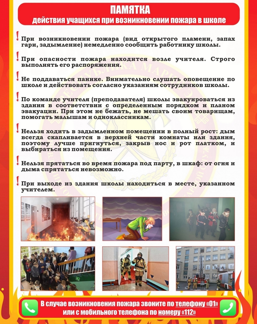 Если пожар начался, нужно немедленно вызвать пожарных по телефону «101» или «112», назвать свою фамилию и точный адрес пожара, позвать на помощь взрослых. Нельзя оставаться в горящем помещении и прятаться в шкафы или иные предметы мебели.