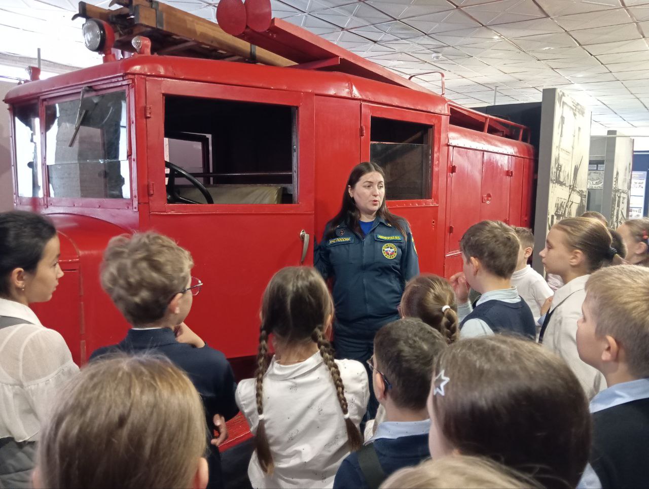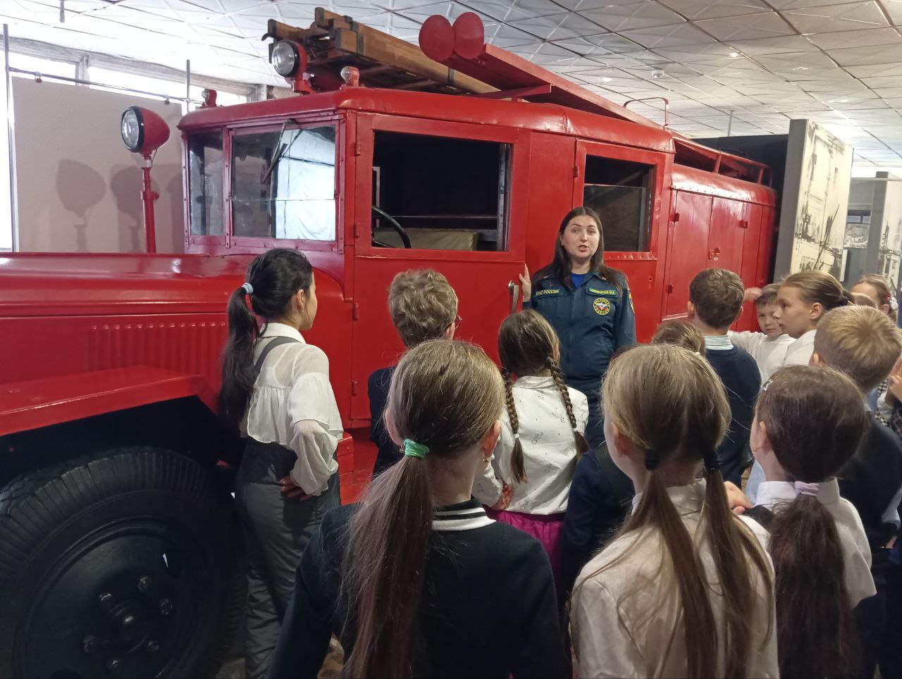 Детям было интересно не только послушать исторические факты, посмотреть форму, пожарные рукава и другие атрибуты пожарного дела, которые представлены в музее, но и примерить на себе некоторые составляющие пожарного костюма, посидеть на первой пожарной машине.