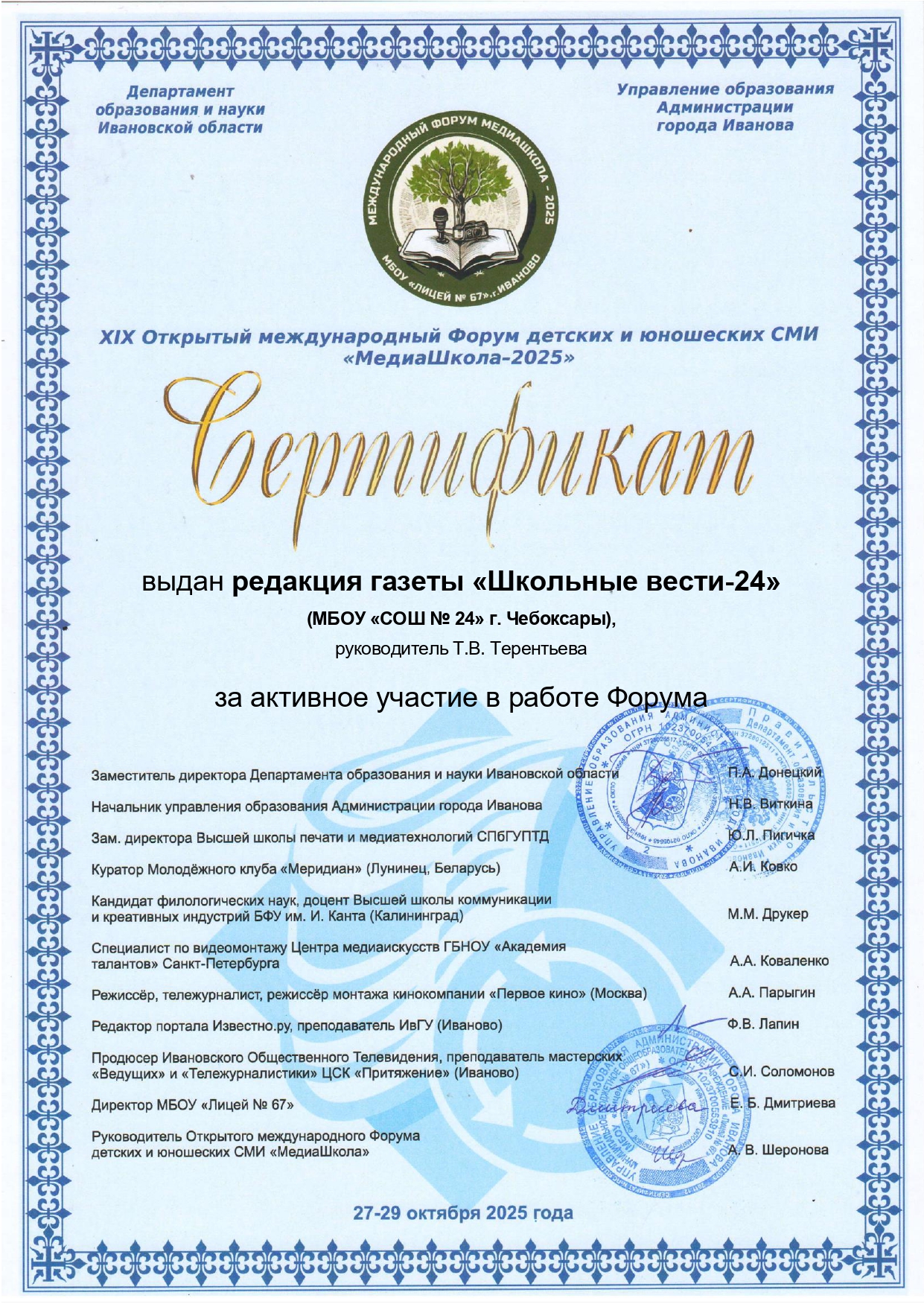 В конце октября- начале ноября традиционно на базе лицея № 67 г. Иваново проходит Открытый международный форум детских и юношеских СМИ «МедиаШкола», в одном из заочных конкурсов которого приняли участие юные журналисты МБОУ «СОШ № 24» г. Чебоксары.