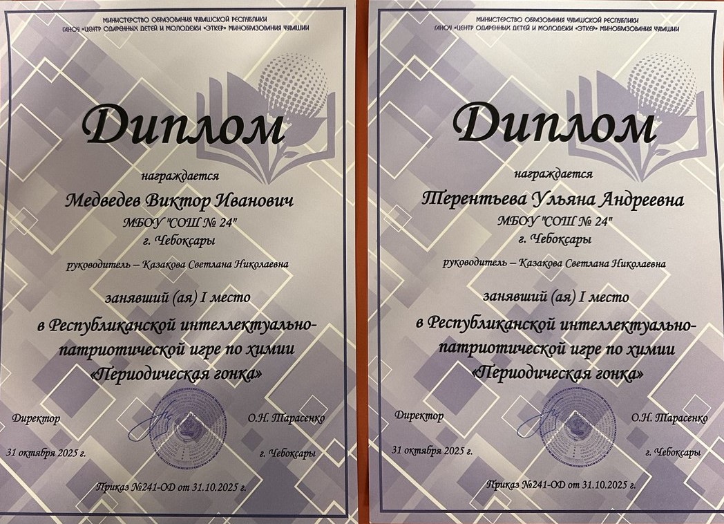 Поздравляем обучающихся 9б класса Медведева В. и Терентьеву У. с победой в очном туре Республиканской интеллектуально – патриотической игры по химии «Периодическая гонка» (рук. Казакова С. Н., учитель химии), которая прошла 31 октября 2025 г. на базе МБОУ «Лицей № 44» г. Чебоксары.