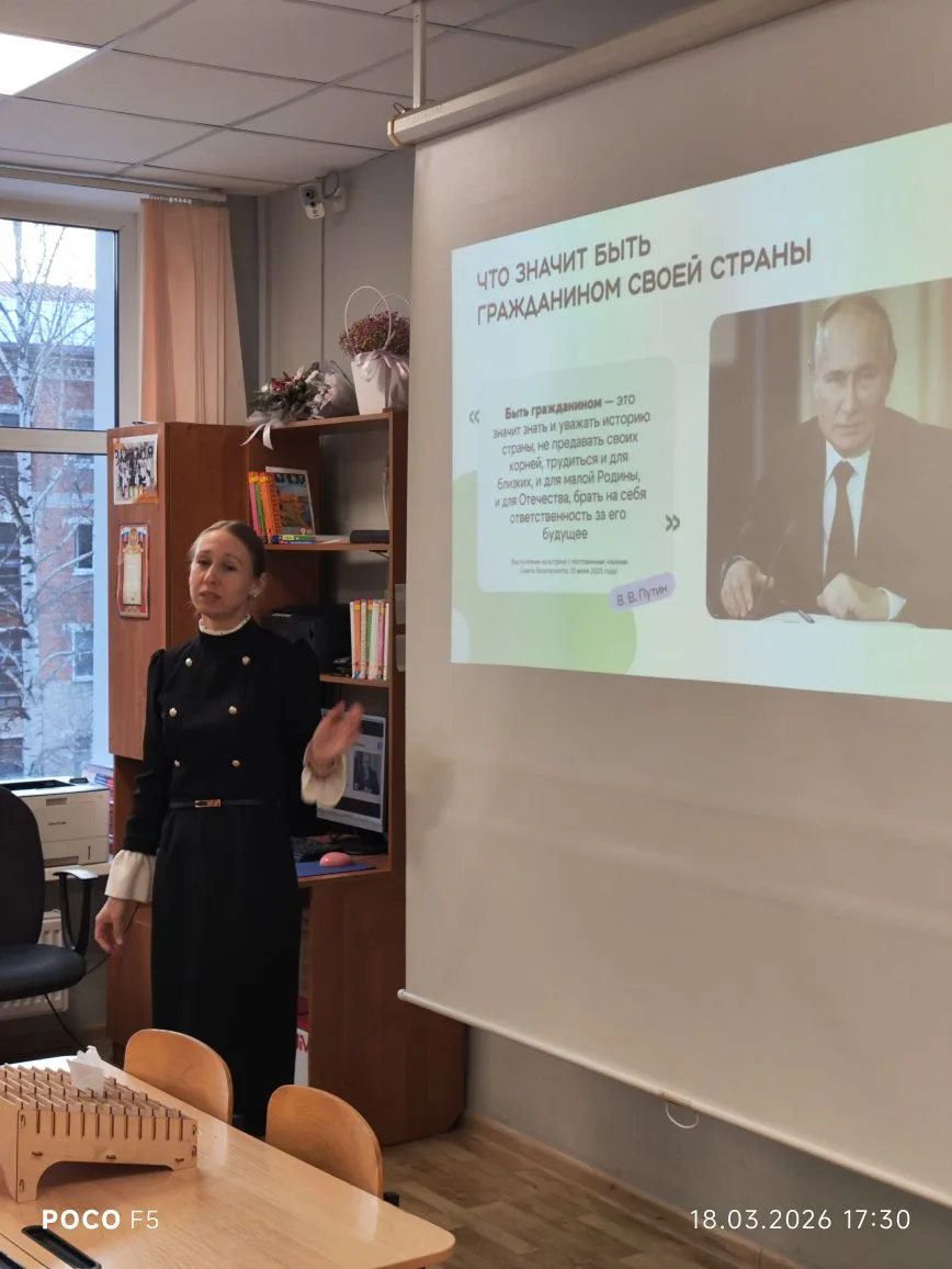 17-18 марта 2026 г. в 1-11 классах прошли мероприятия в рамках празднования Дня воссоединения Крыма с Россией. Во всех классах прошел Урок мужества «Возвращение в родную гавань». Целью урока является сохранение исторической памяти о событиях Крымской весны 2014 года, об истории Крымского полуострова.