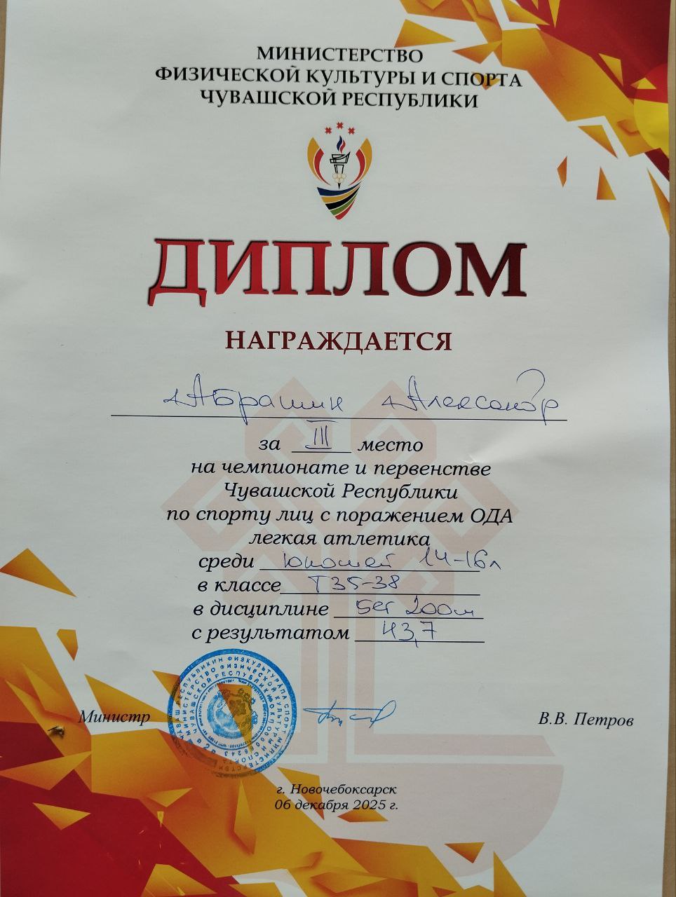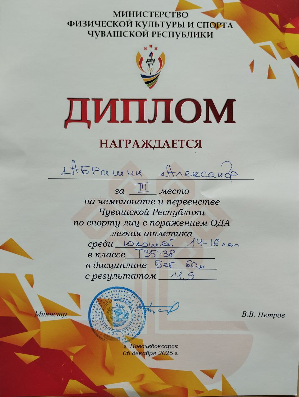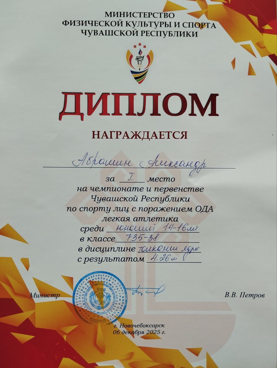 В Чемпионате и Первенстве Чувашской Республики по спорту для лиц с ПОДА, которые проходили 6 декабря 2025 г. в г. Новочебоксарск, Абрашин А. (7в класс) завоевал золотую медаль в толкании ядра, две бронзовые медали в беге на 200м и в беге на 60м.