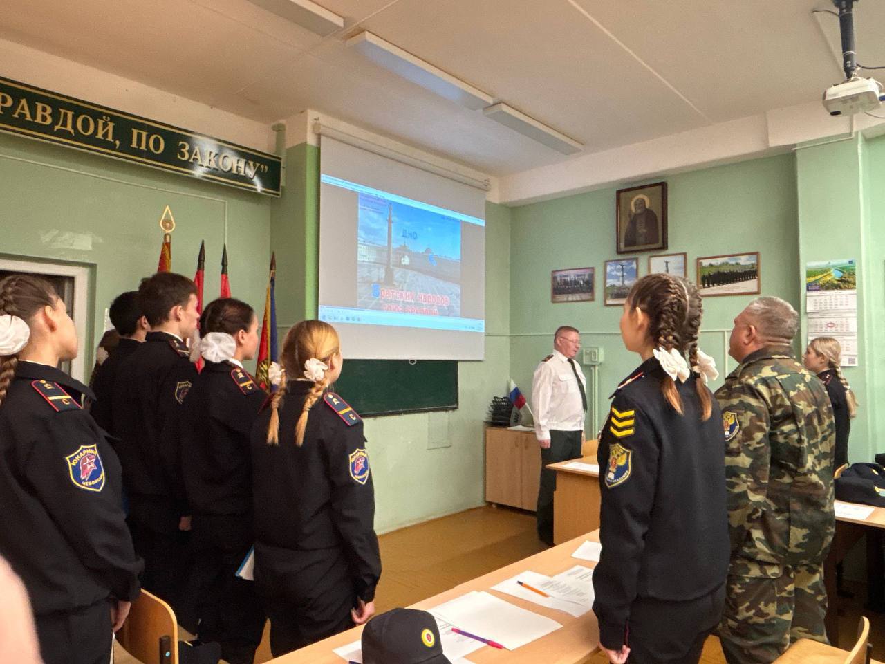 Вместе со своими наставниками из МВД и Общественной Палаты региона слушатели старших курсов Детской полицейской академии обсудили историю и значение флага, герба, гимна Российской Федерации, Знамени Победы, а также обсудили права и обязанности детей. Ученица нашей школы Ахлаткина В. (9и класс), слушатель 3 курса, рассказала о Знамени Победы.