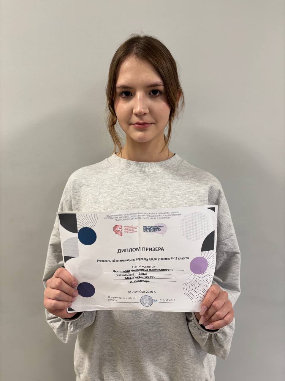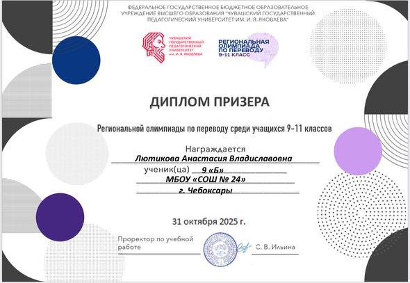 Поздравляем ученицу 9б класса Лютикову А. – призера региональной олимпиады по переводу среди обучающихся 9-11 классов (рук. Чеснокова Н. А., учитель английского языка).
