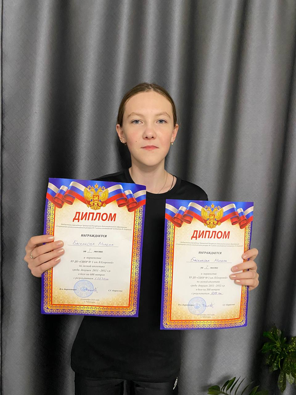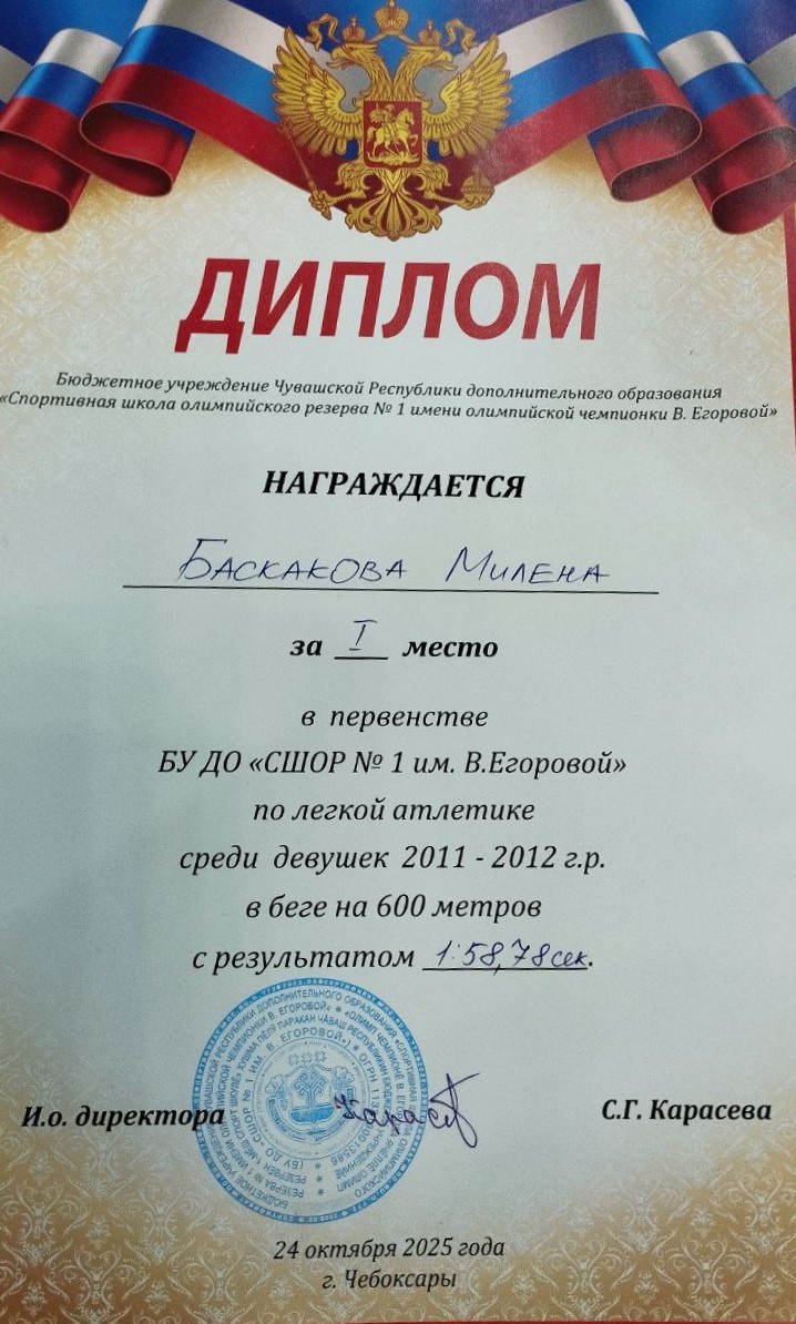 Поздравляем Баскакову М., ученицу 7а класса, занявшую 1 место в первенстве БУ ДО «СШОР № 1 им. В. Егоровой» по легкой атлетике среди девушек 2011-2012 г.р. в беге на 600 м, проходившем 24 октября 2025 г.