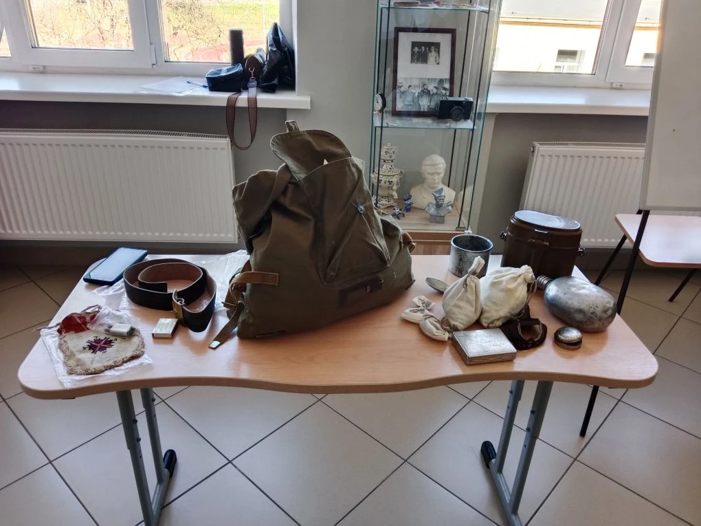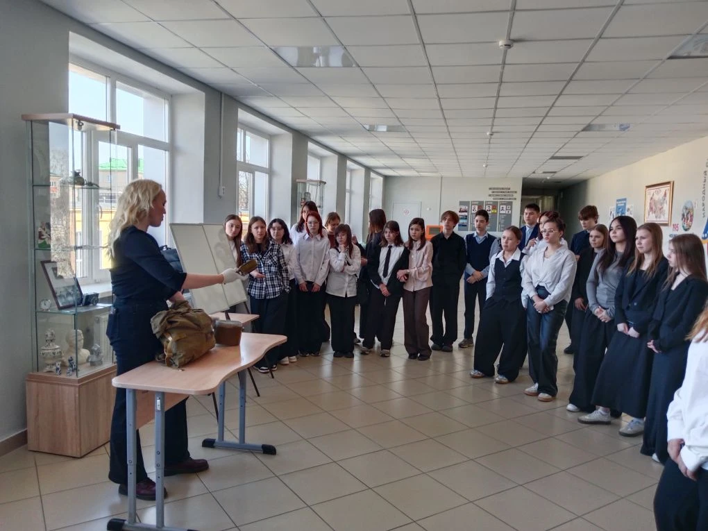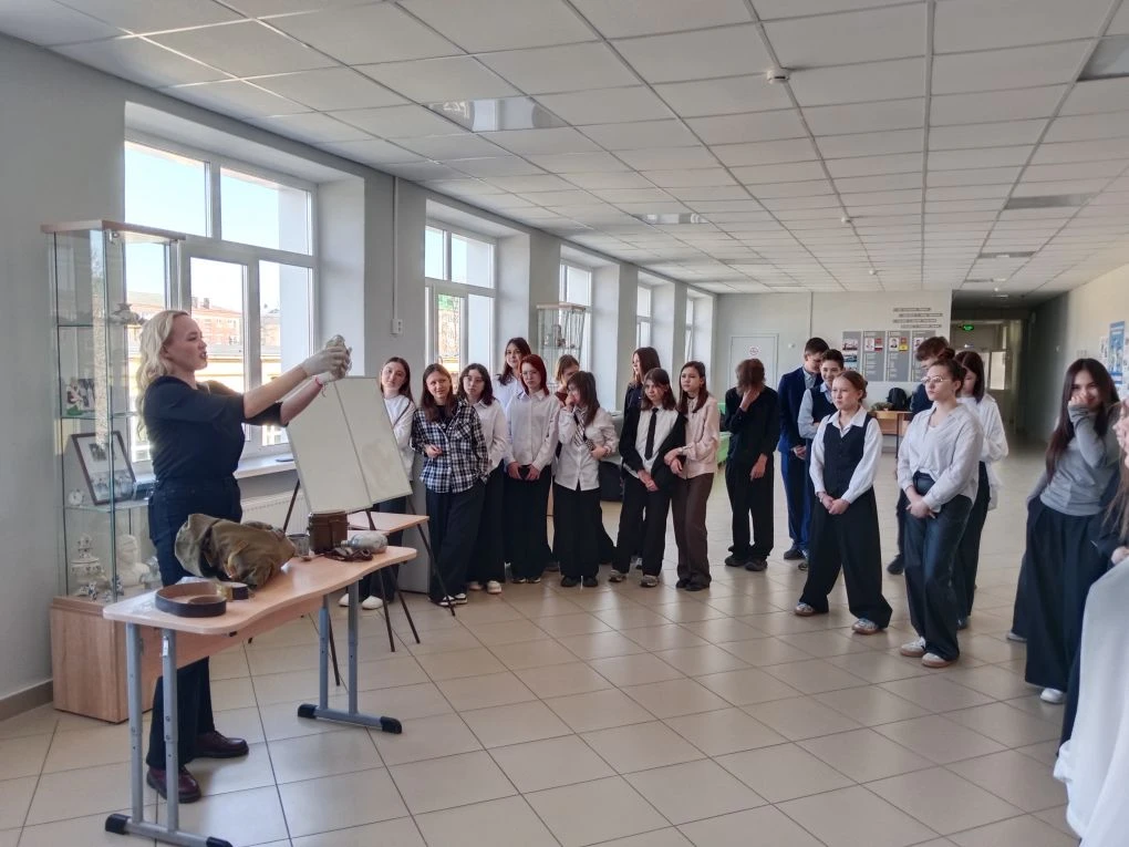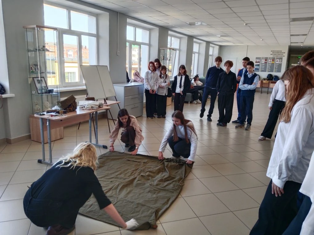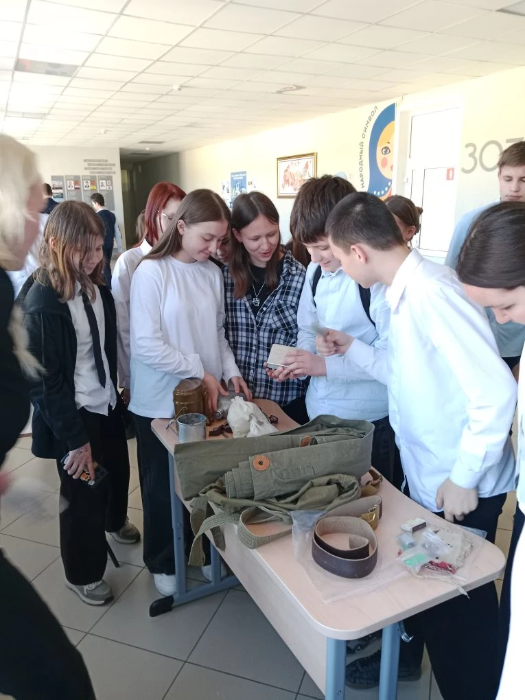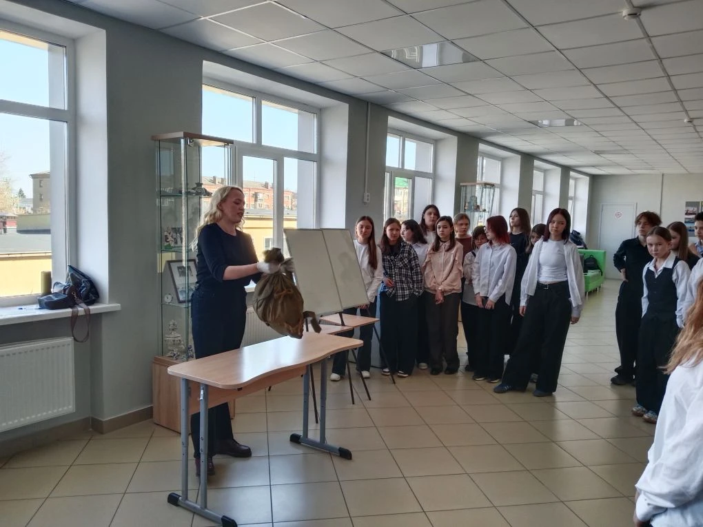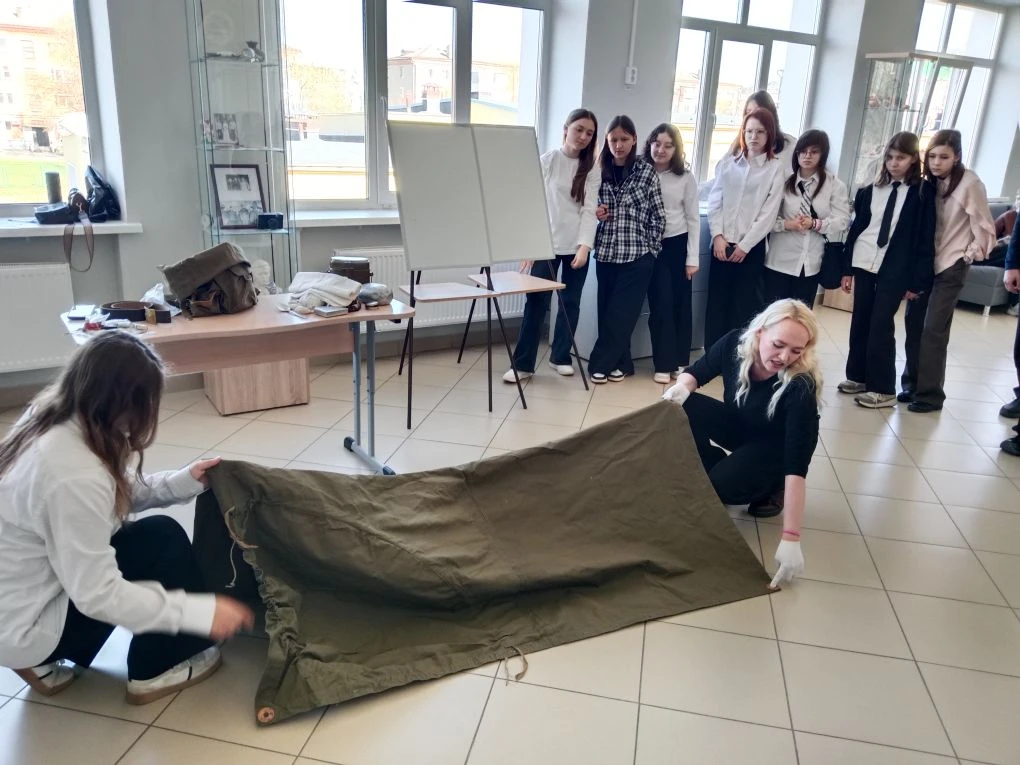 В рамках проекта «День музея в школе» 15 апреля 2026 г. для обучающихся 8-х классов прошло интерактивное занятие «Что в мешках носили деды, одержавшие победу». Участники мероприятия познакомились с содержимым вещмешка бойца Красной армии времен Великой Отечественной войны и узнали о предназначении каждого предмета: кисет, фляжка, сухпаек, котелок и прочее.