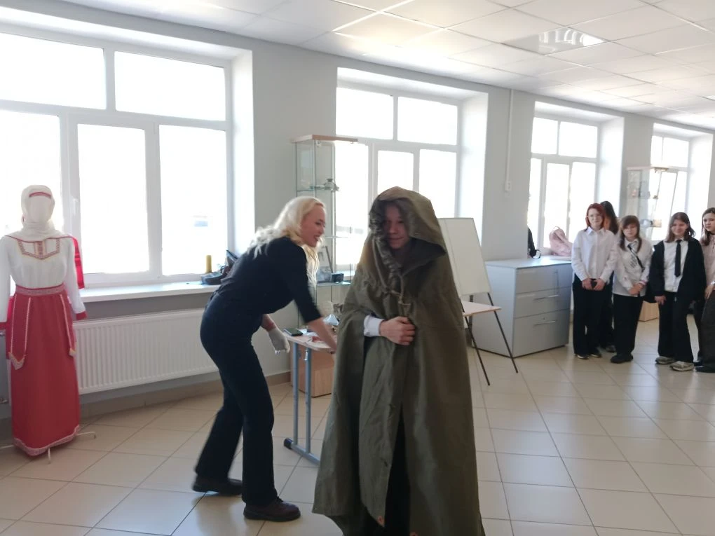 Сотрудник Чувашского национального музея Татьяна Павлова рассказала ребятам о таких предметах форменной одежды военнослужащих РККА, как пилотка, поясной ремень, портянки. Для сравнения были показаны немецкие трофейные вещи времен Великой Отечественной войны. Также в ходе занятия ребята узнали о героических подвигах наших земляков, боевых наградах и особенностях фронтовой жизни.