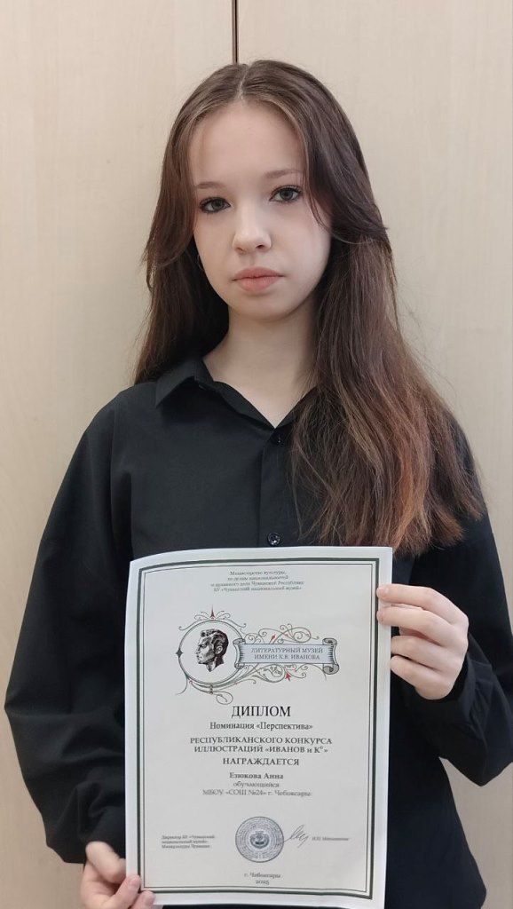 20 октября 2025 г. на торжественном мероприятии, посвященном 85-летию Литературного музея, председатель жюри — председатель Союза чувашских художников Наталия Соловьева — вручила дипломы призерам. Диплом получила Езюкова А., ученица 8б класса.