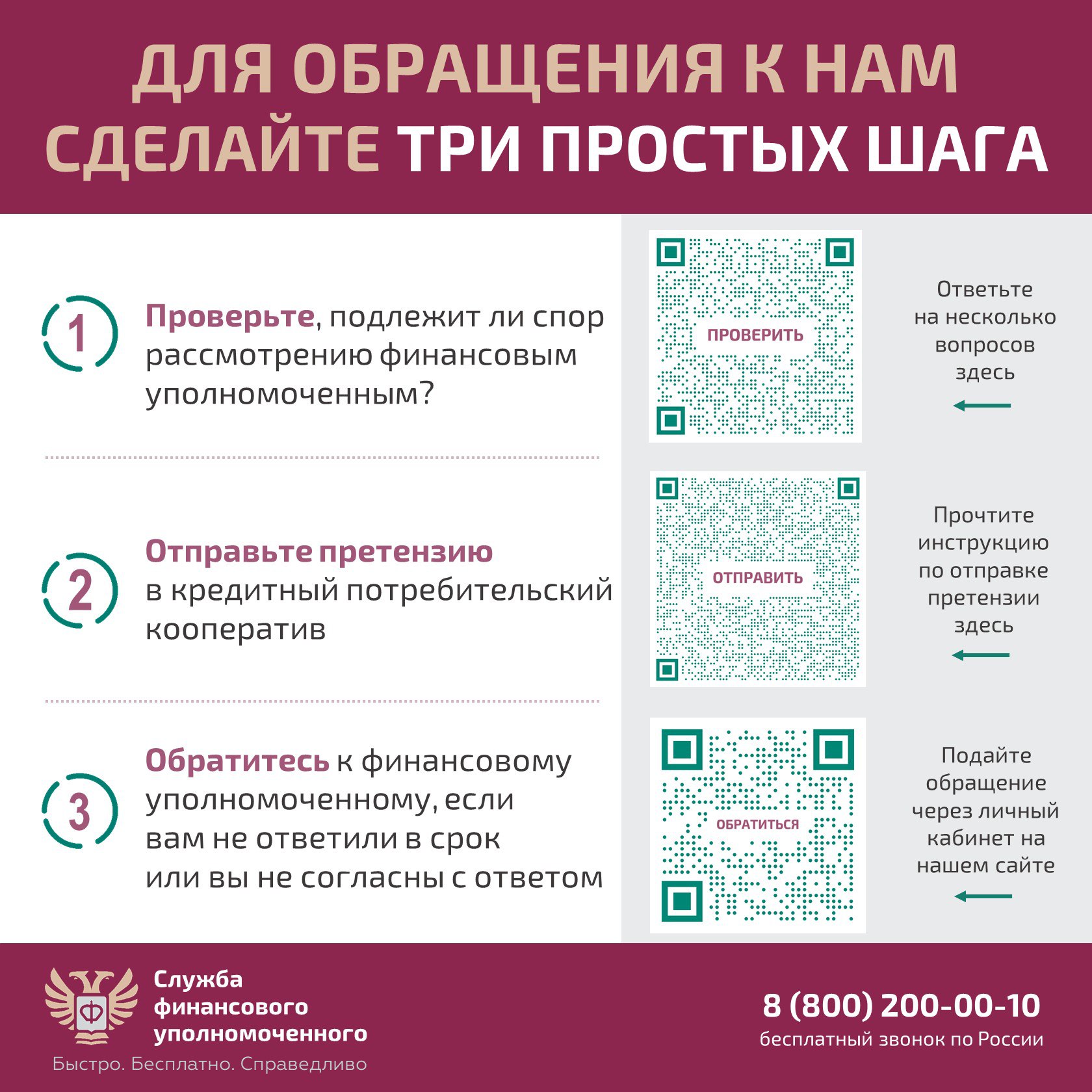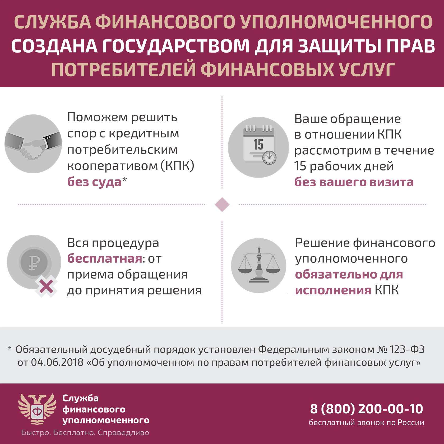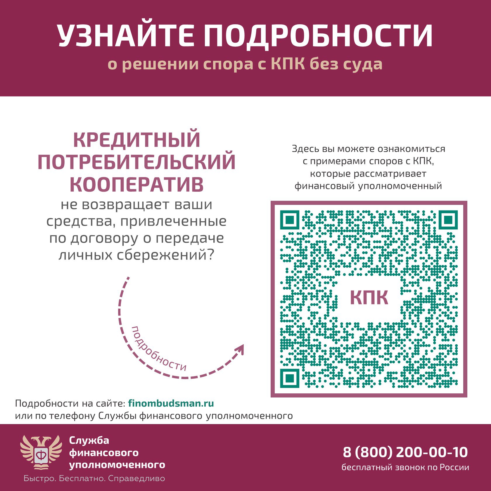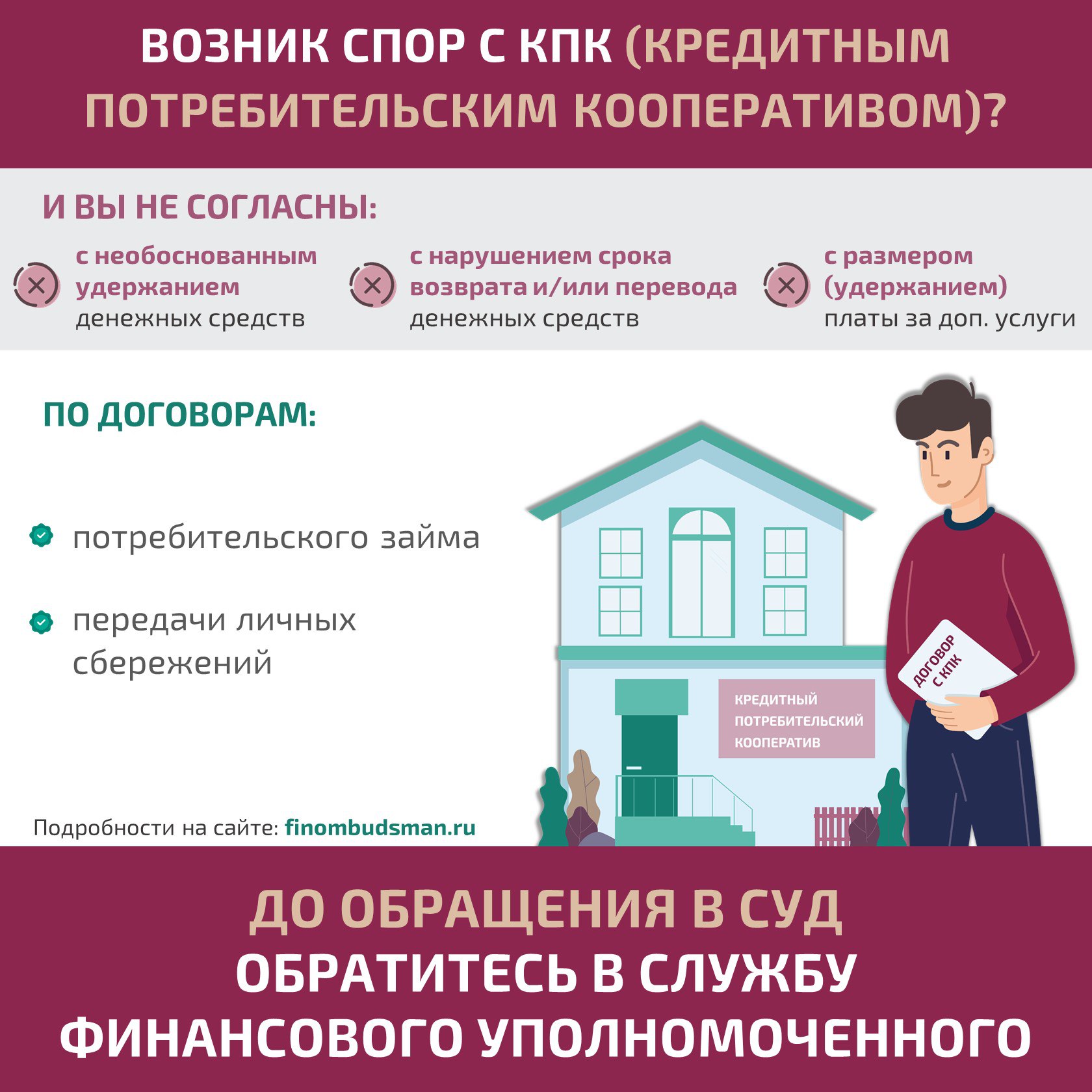 Для решения спора с КПК без суда обратитесь к финансовому уполномоченному. Он бесплатно рассматривает в досудебном порядке обращения клиентов КПК – физических лиц, содержащие денежные требования в размере не более 500 тысяч рублей.