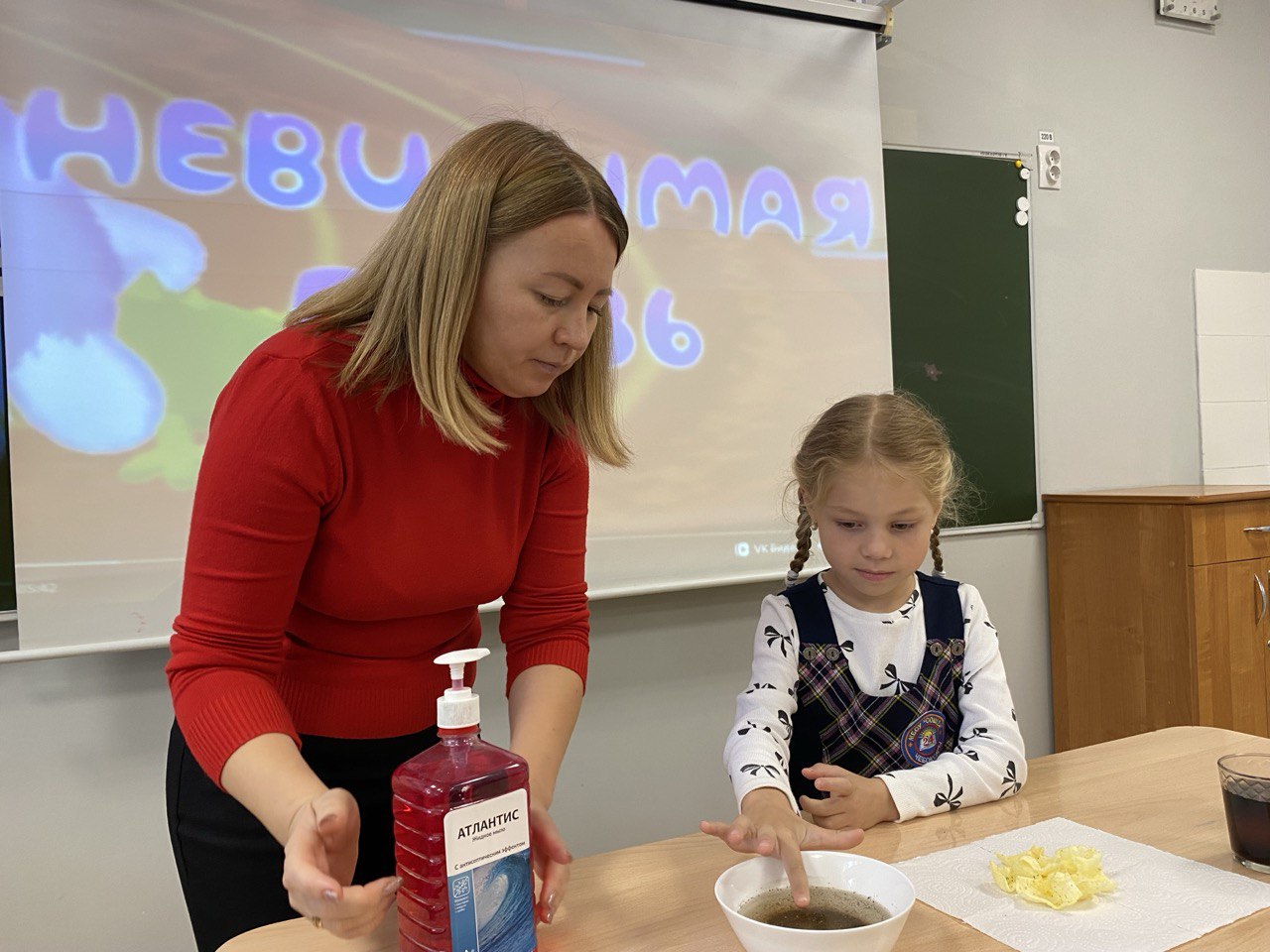 Ребята обсудили увиденное, а затем вместе с классным руководителем Афанасьевой С. Ю. провели опыты по поиску «Невидимой грязи».