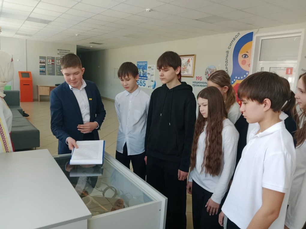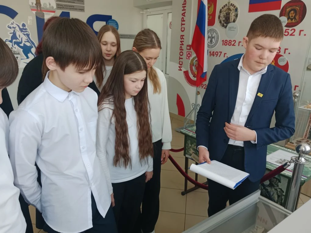 12 марта 2026 г. активист музейного дела, ученик 6б класса Арсений Н. провел увлекательную и познавательную экскурсию для обучающихся 7б класса, в ходе которой ребята погрузились в атмосферу прошлого и узнали много интересного об истории нашей школы и г. Чебоксары. Экскурсовод познакомил ребят с разными экспозициями, которые помогли понять и увидеть быт наших предков (старинная утварь, традиционная одежда чувашей эпохи средневековья и т.д.).