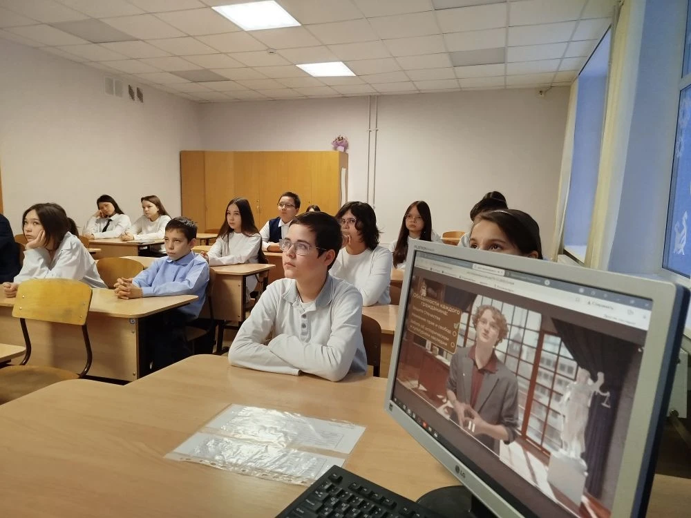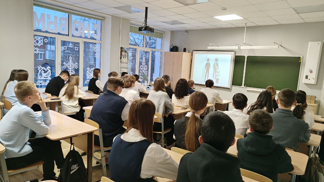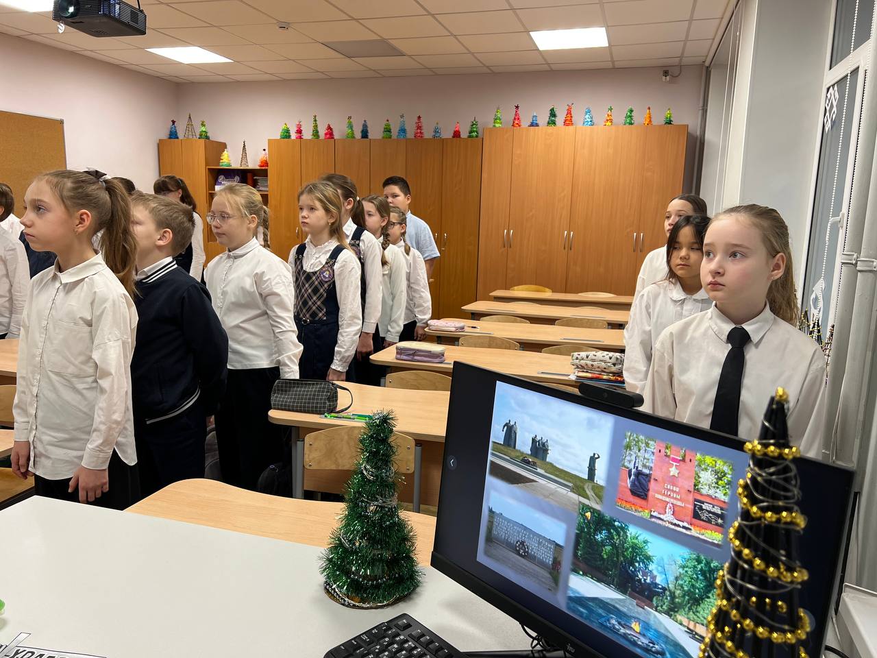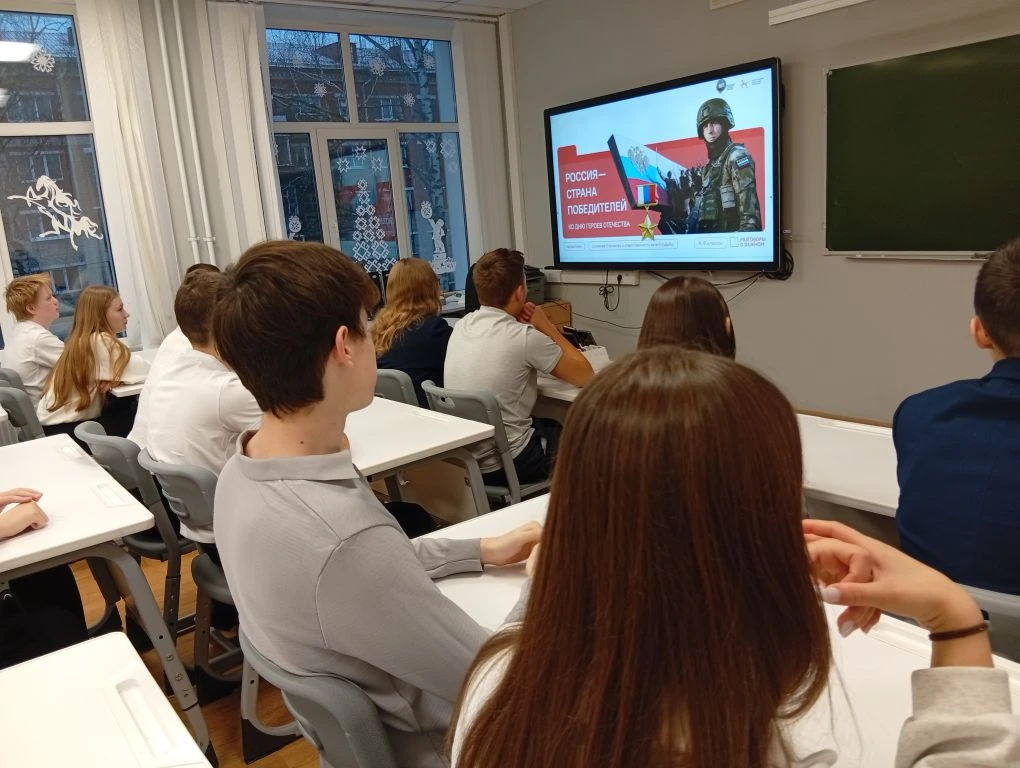 Из видеоролика «Россия – страна победителей» обучающиеся узнали об истории ордена Святого Георгия и Георгиевской ленточке, о высших званиях Герой Советского Союза и Герой России.Ребята побывали в Великом Новгороде у памятника «Тысячелетие России» – символе многих поколений выдающихся личностей, прославивших страну на протяжении десяти столетий, на горельефном фризе которого изображено более ста исторических фигур: военных и гражданских, писателей и художников, просветителей, государственных деятелей. Школьники обсудили, почему Россия – страна победителей и какие победы одерживают представители мирных профессий. Старшеклассники вспомнили о настоящих героях: подмосковных школьниках Артеме Донскове и Исламе Халилове, эвакуировавших через запасный выход и спасших более 100 человек во время теракта в «Крокус Сити Холле», о военном корреспонденте Евгении Поддубном, первым получившем звание Героя Российской Федерации, о летчике-испытателе Николае Куимове, погибшем в 2021 году во время испытаний, но успевшем увести горящий самолет от жилых домов в подмосковной Кубинке,о подвиге врача Александра Филиппова, отказавшемся эвакуироваться и завершившем сложнейшую операцию во время пожара в больнице, о героях родного края и земляках, удостоенных звания Героя Российской Федерации и других высших государственных наград.