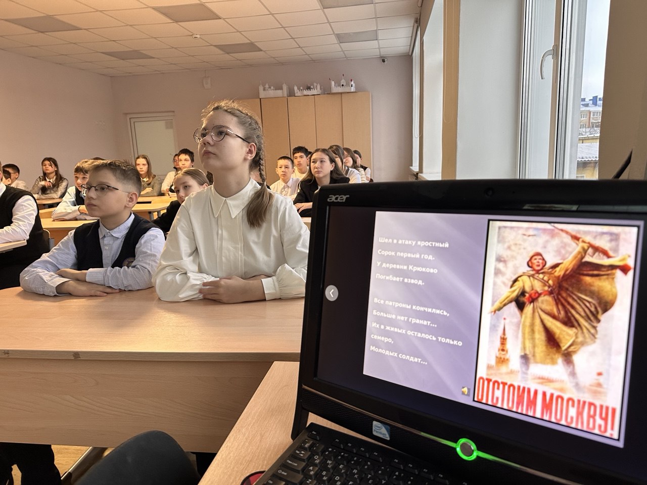 Классные руководители рассказали обучающимся о ходе войны, о военном параде 7 ноября на Красной площади, о планах фашистов «Барбаросса». Ребята с интересом слушали о подвигах Героев в битве за Москву: об использовании аэростатов, которые были нужны, чтобы затруднить немцам бомбометание по городу, а также о том, какие важные функции выполнял московский метрополитен. В продолжение мероприятия был проведен интерактивная викторина«Битва за Москву».