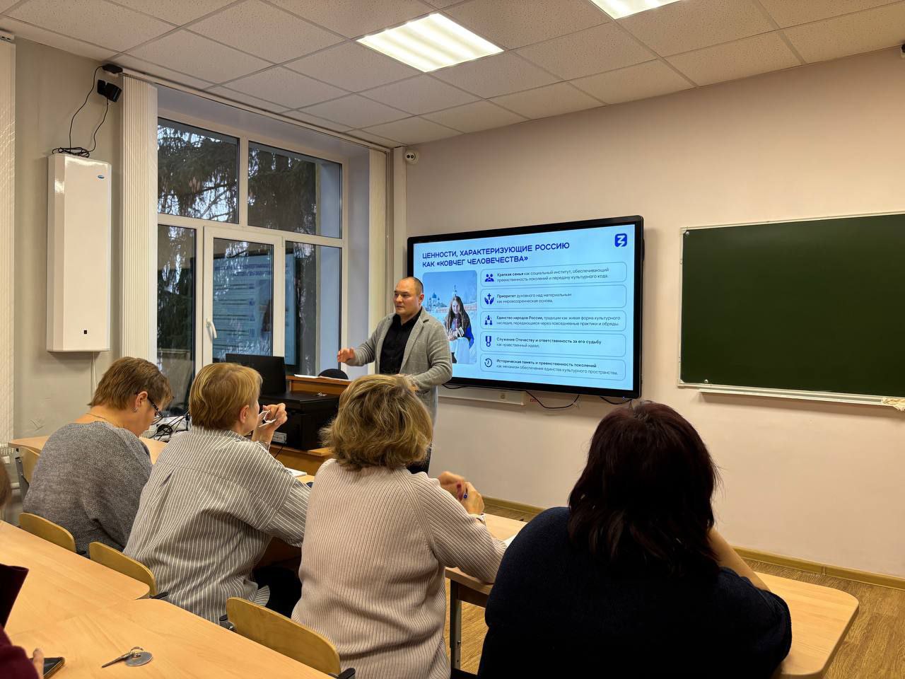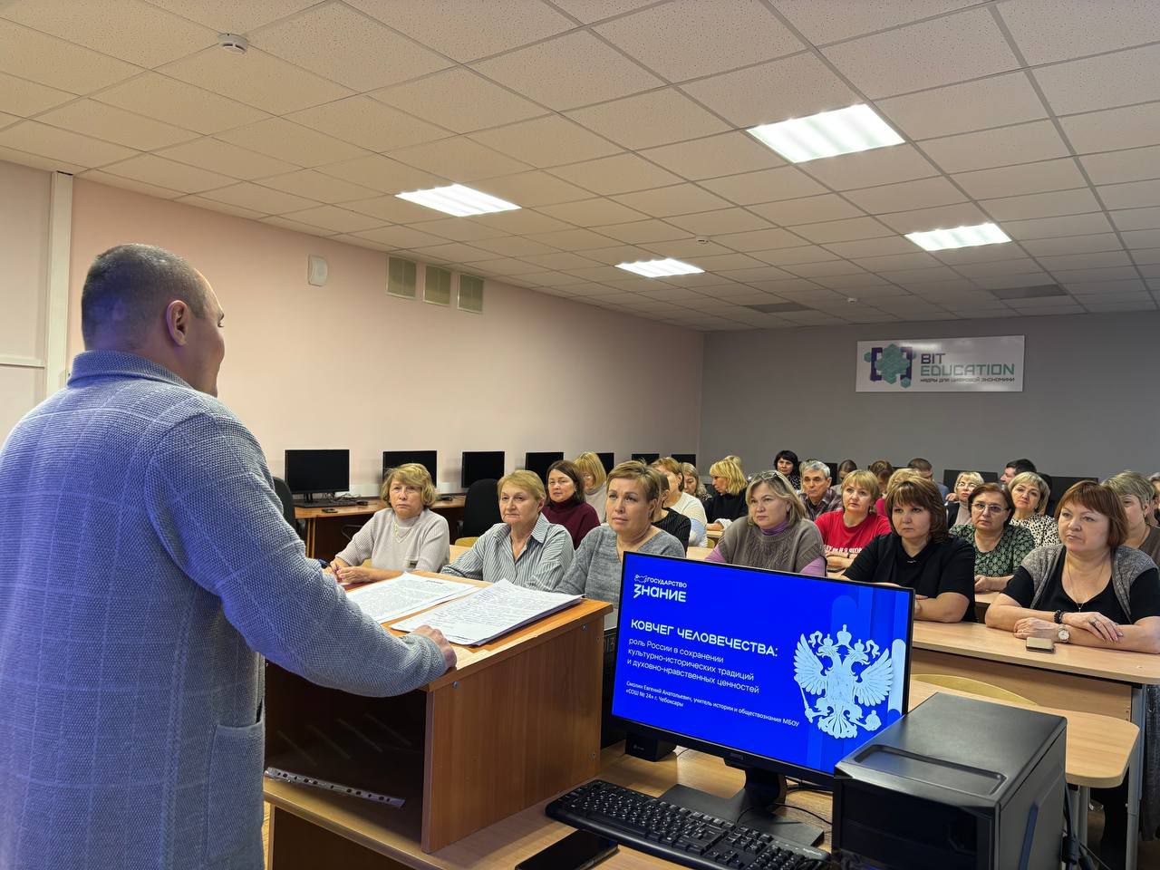 10 ноября 2025 г. лектор Всероссийского общества «Знание», кандидат исторических наук, учитель истории и обществознания МБОУ «СОШ № 24» г. Чебоксары Смолин Е. А. выступил перед педагогами школы с просветительской лекцией на тему «Ковчег человечества: роль России в сохранении культурно-исторических традиций и духовно-нравственных ценностей».
