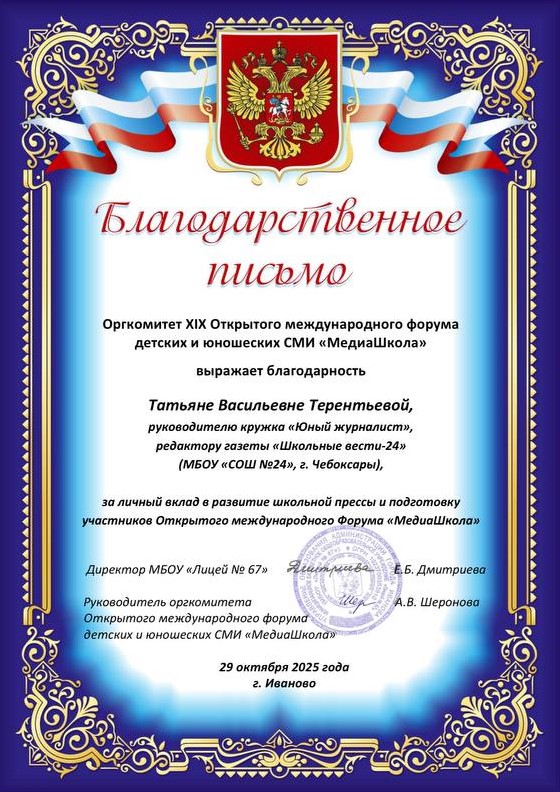 Поздравляем руководителя кружка «Юный журналист», редактора школьной газеты «Школьные вести - 24» Терентьеву Т. В., чья работа отмечена благодарственным письмом оргкомитета XIX Открытого международного форума детских и юношеских СМИ «МедиаШкола» за личный вклад в развитие школьной прессы и подготовку участников Открытого международного форума «МедиаШкола».
