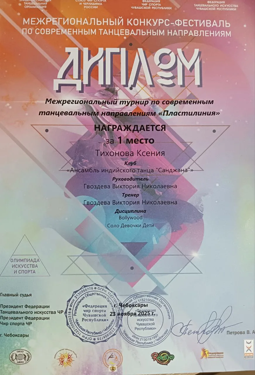 Поздравляем ученицу 6а класса Тихонову К., занявшую 1 место в Межрегиональном турнире по современным танцевальным направлениям «Пластилиния»! Ксения совершенствует свое мастерство в ансамбле индийского танца «Санджана» под руководством тренера Гвоздевой В. Н.