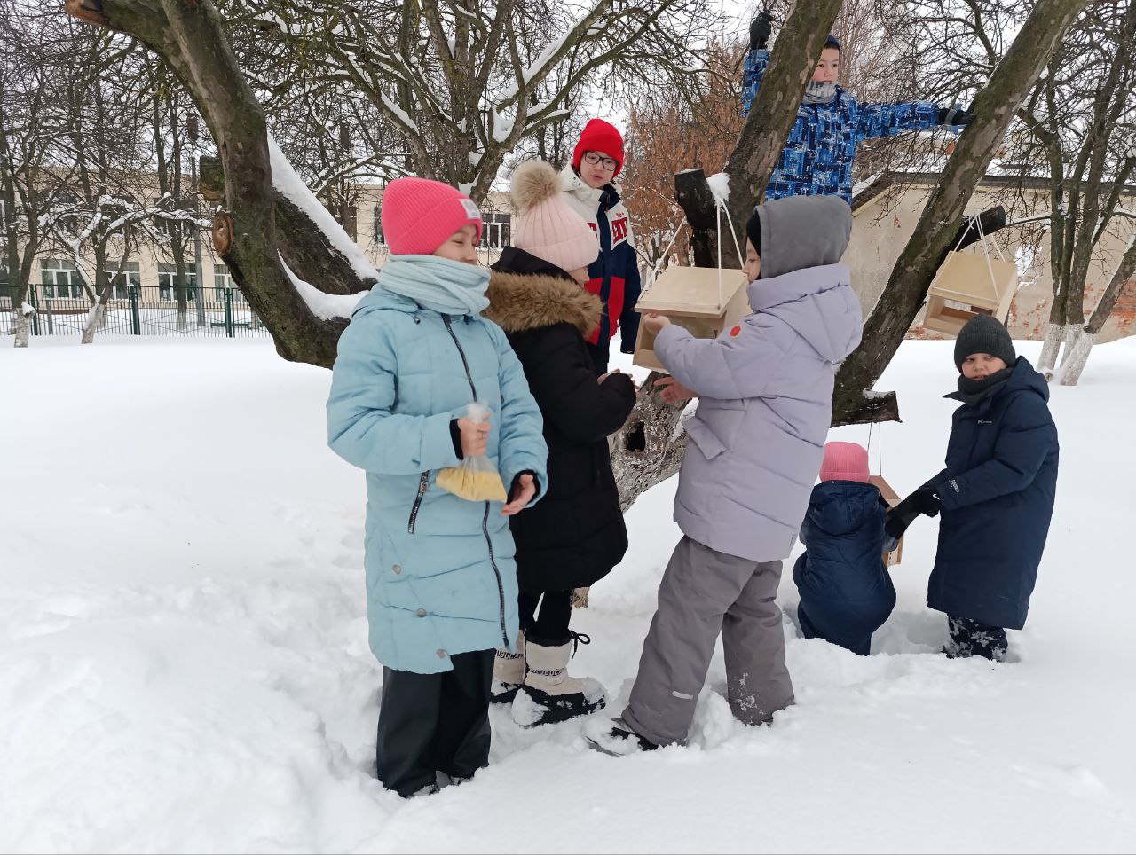 Но не страшны угрозы матушки-зимы птичкам, которые обитают в нашем крае, потому что ребята заботятся о братьях наших меньших: ребята повесили кормушки, которые они сделали со своими родителями и наполнили кормом.